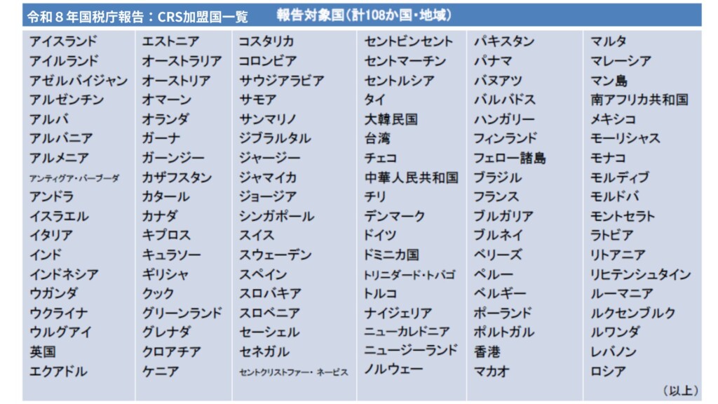 2026年時点でのCRS加盟国は108か国で、加盟国同士が居住地税務局へ口座情報を自動開示しています。