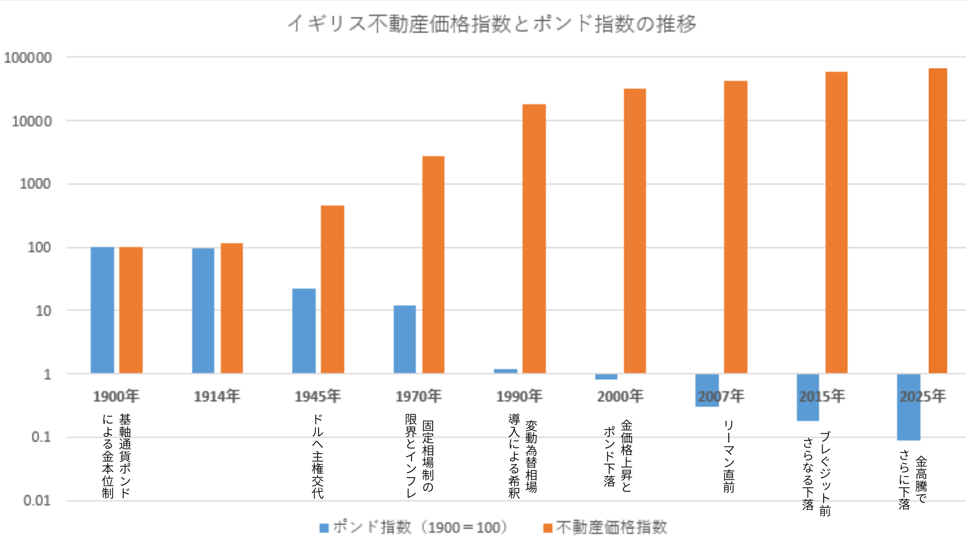 上のグラフは1900年のポンドと不動産地価を100とした指数の推移です。