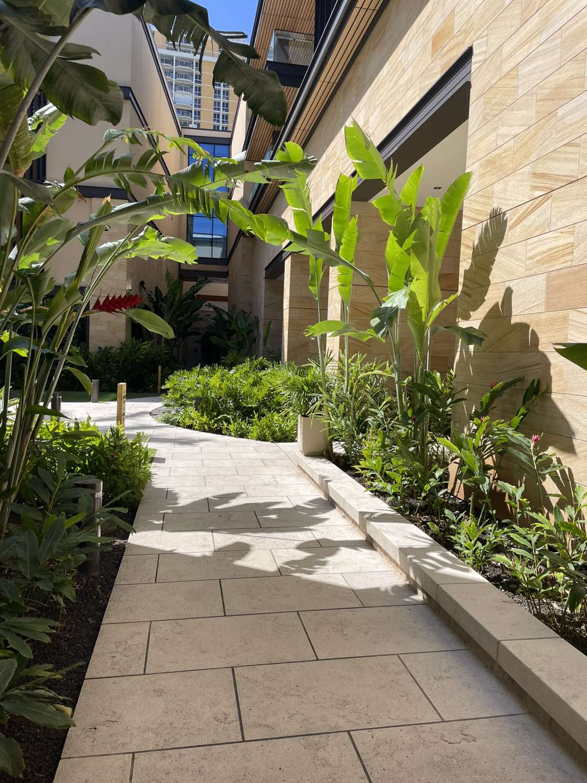 ホノルルの高級物件の多くが高層タワーであるのに対し、パークレーンはあえて6階建てという低層のデザインを採用しています。約3ヘクタールもの広大な敷地に、全8棟が翼を広げるように並ぶ構造は、まるで「空中の戸建て邸宅」に住んでいるかのようなプライベート感を生み出しています。