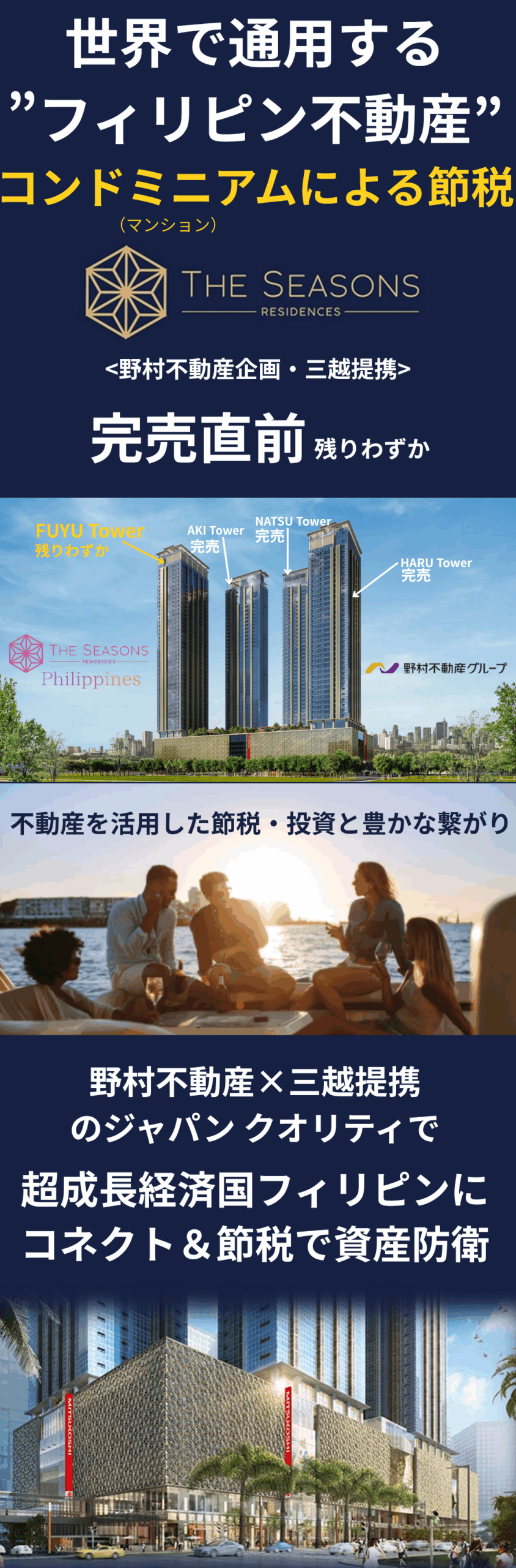 「THE SEASONS RESIDENCES (シーズンスレジデンス)」の主な訴求ポイントは、以下の3つの要素に集約されます。これは、投資家と居住者双方にとって大きな魅力です。
